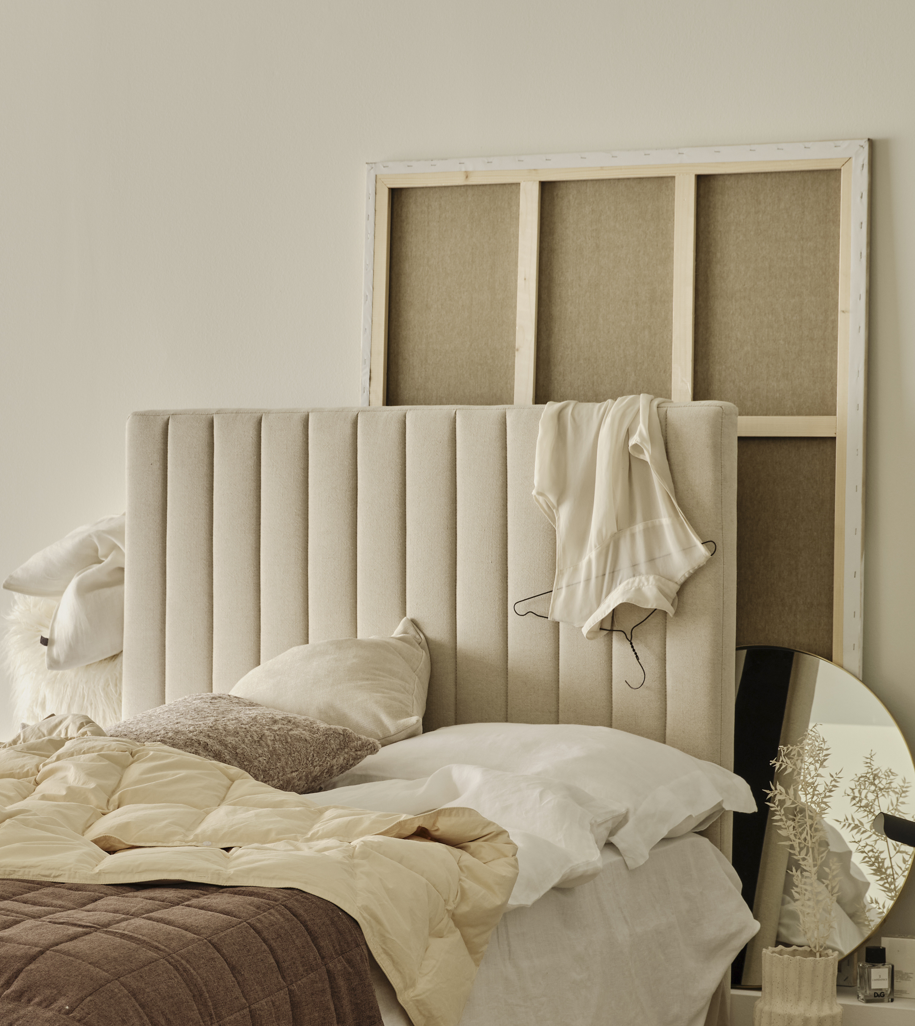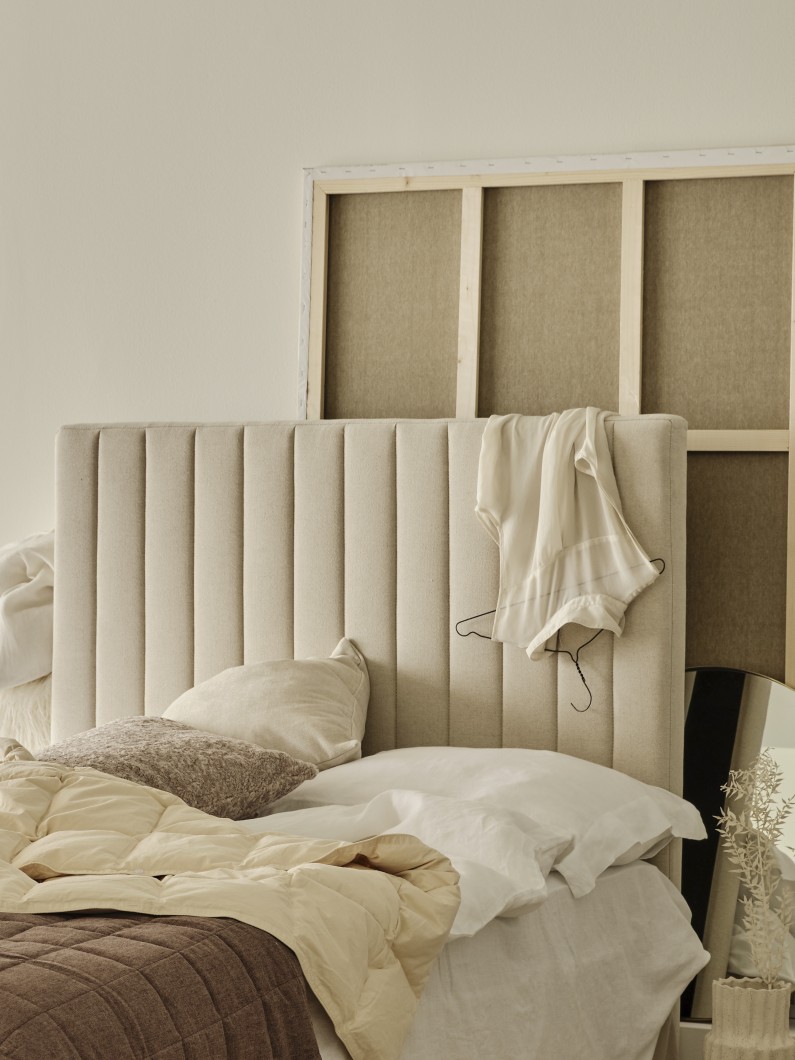 Design et nyt udtryk på dit soveværelse med den stilrene sengegavl Derby i en blød hørblanding. Sengegavlen fås både i 90, 120, 160 og 180 cm.