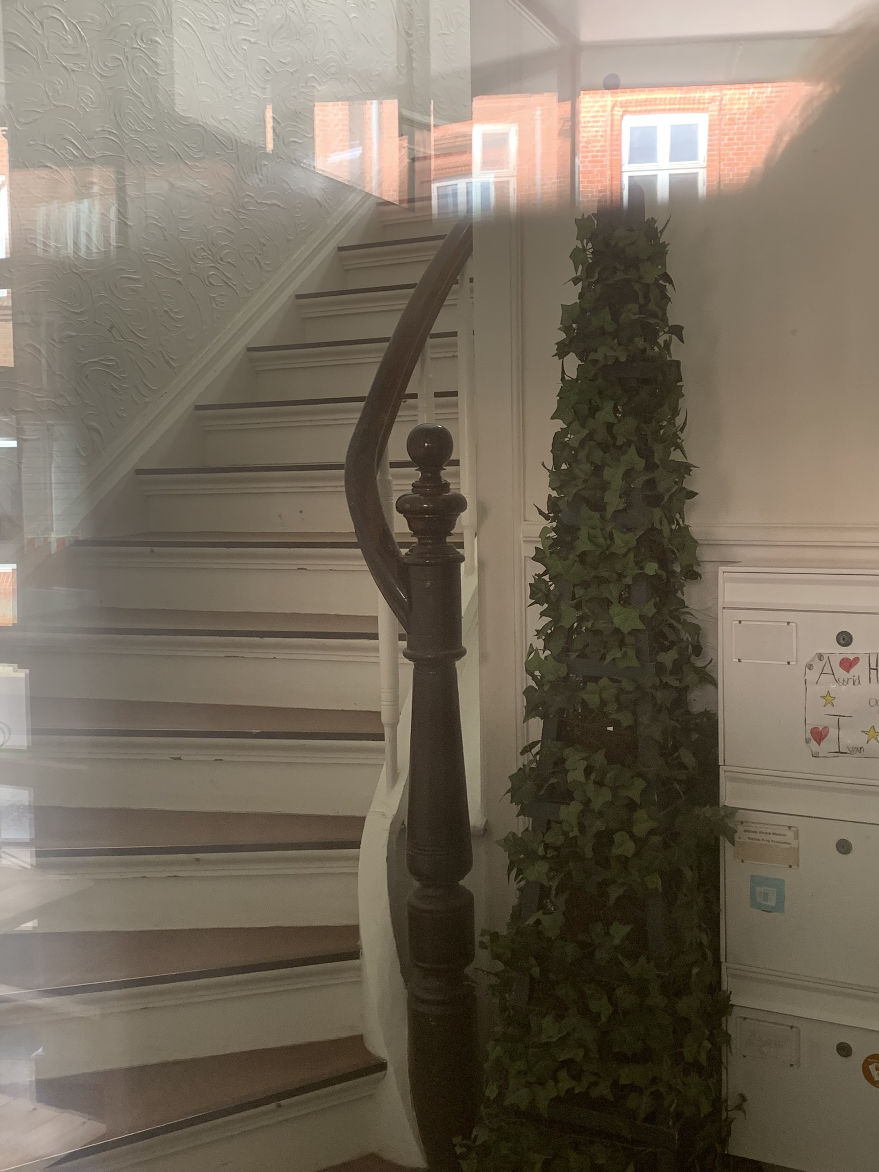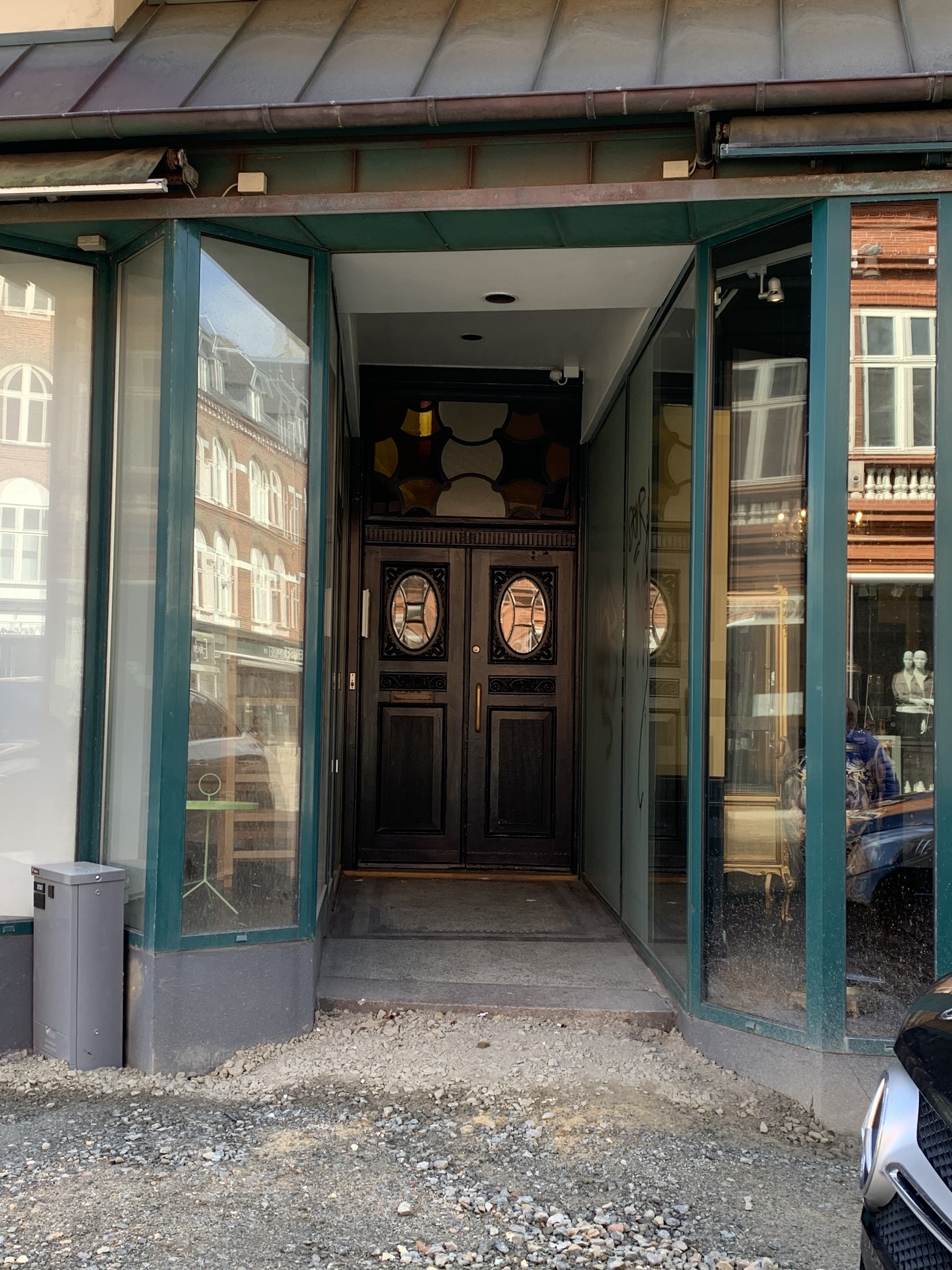 Herefter tog vi en tur ned ad strøget til den opgang, hvor vi kissemissede og skråt overfor lå det første sted, vi boede sammen, efter vi var blevet gift. Det var to værelser med en håndvask og en dyppekoger - og toilet i kælderen. Meget beskedne forhold! Men vi var glade.