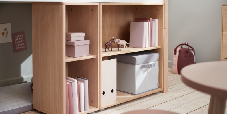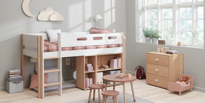 I denne kollektion finder du alt fra enkeltmandssenge, halvhøjesenge med stiger - til høje senge samt kommoder og reoler, som tilfører børneværelset et unikt præg.