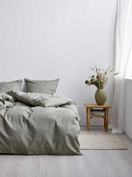 Det nye 'Common'-sengesæt er et glimrende eksempel på Södahls miljøindsats, der ligeledes er OEKO-TEX ®-certificeret. Sættet har et enkelt, stribet look, der giver en usædvanlig ro, kommer med praktiske lynlåse og er lavet i en renforcévævning; en forbedret lærredsvævning med finere garner, som giver en høj trådtæthed og en glat, ensfarvet overflade. Vælg mellem farverne 'golden', 'light grey', 'china blue' og 'khaki'.