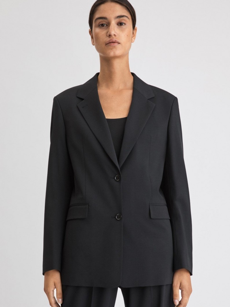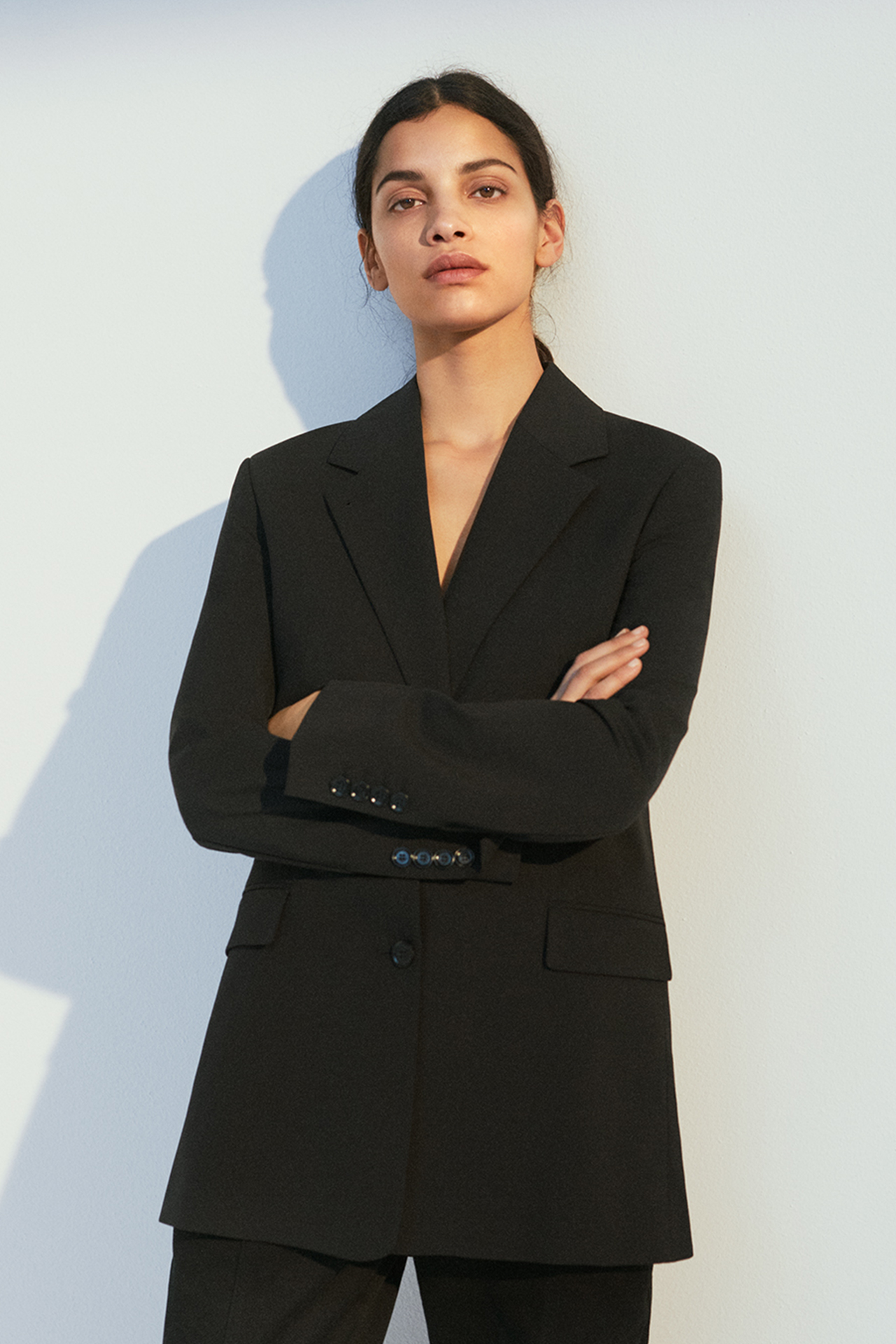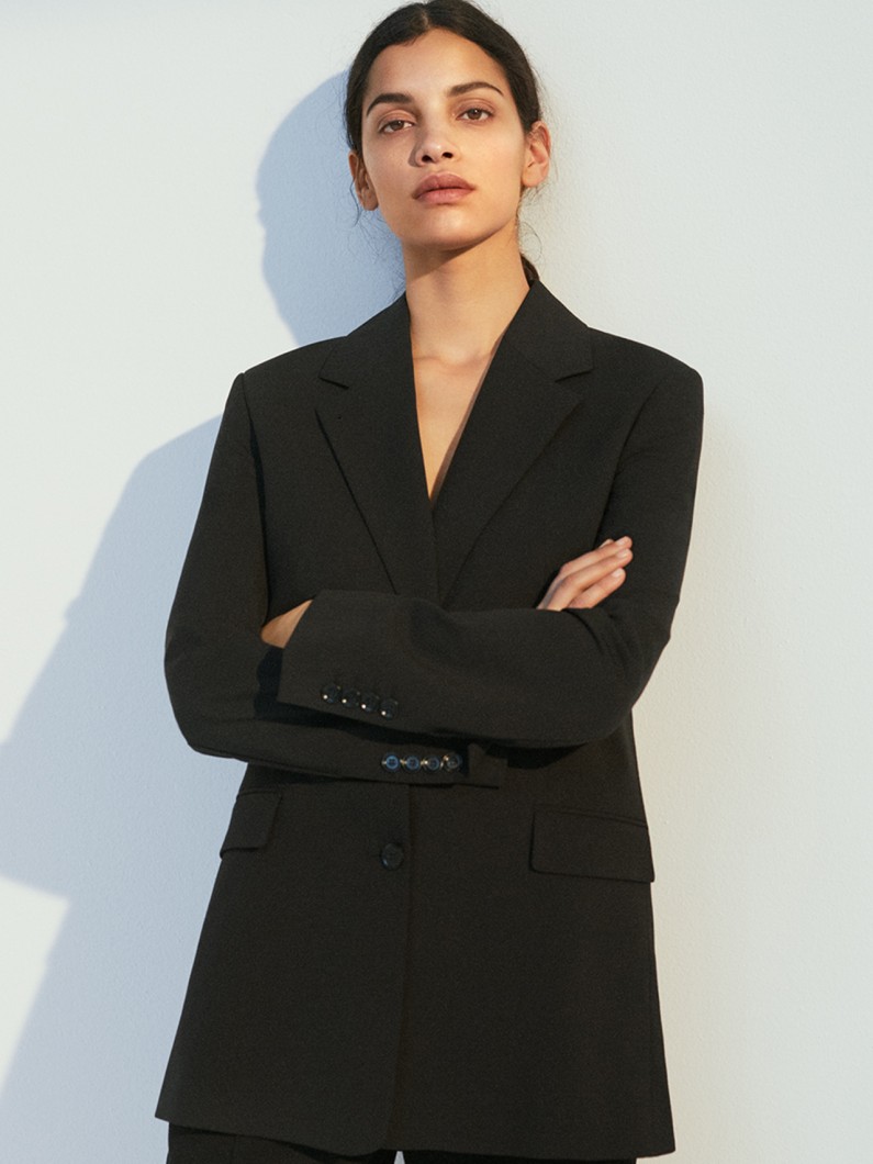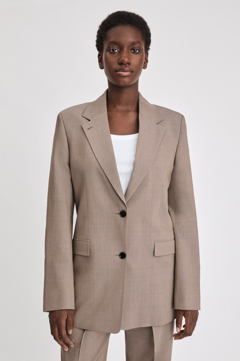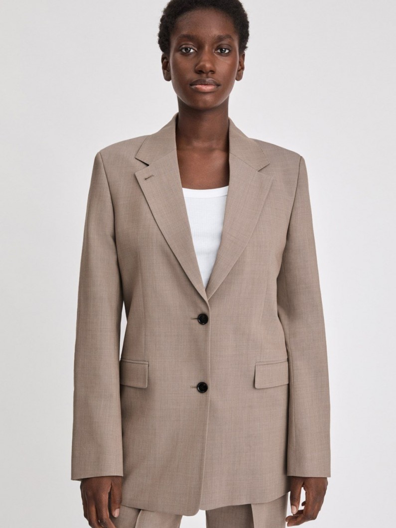 Både udgaver i sort og marine er fantastiske, men også forårets nye lyse farve er aldeles skøn. Bukserne er smukke med vidde og jakkerne er i et helt enkelt snit. Vælg at sætte en lille top, en silkeskjorte eller en tynd sweater under - eller vælg at bruge jakken uden andet end BH-en under.