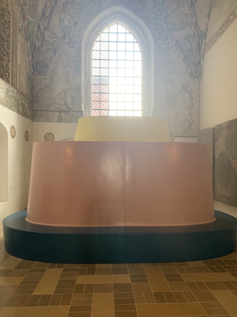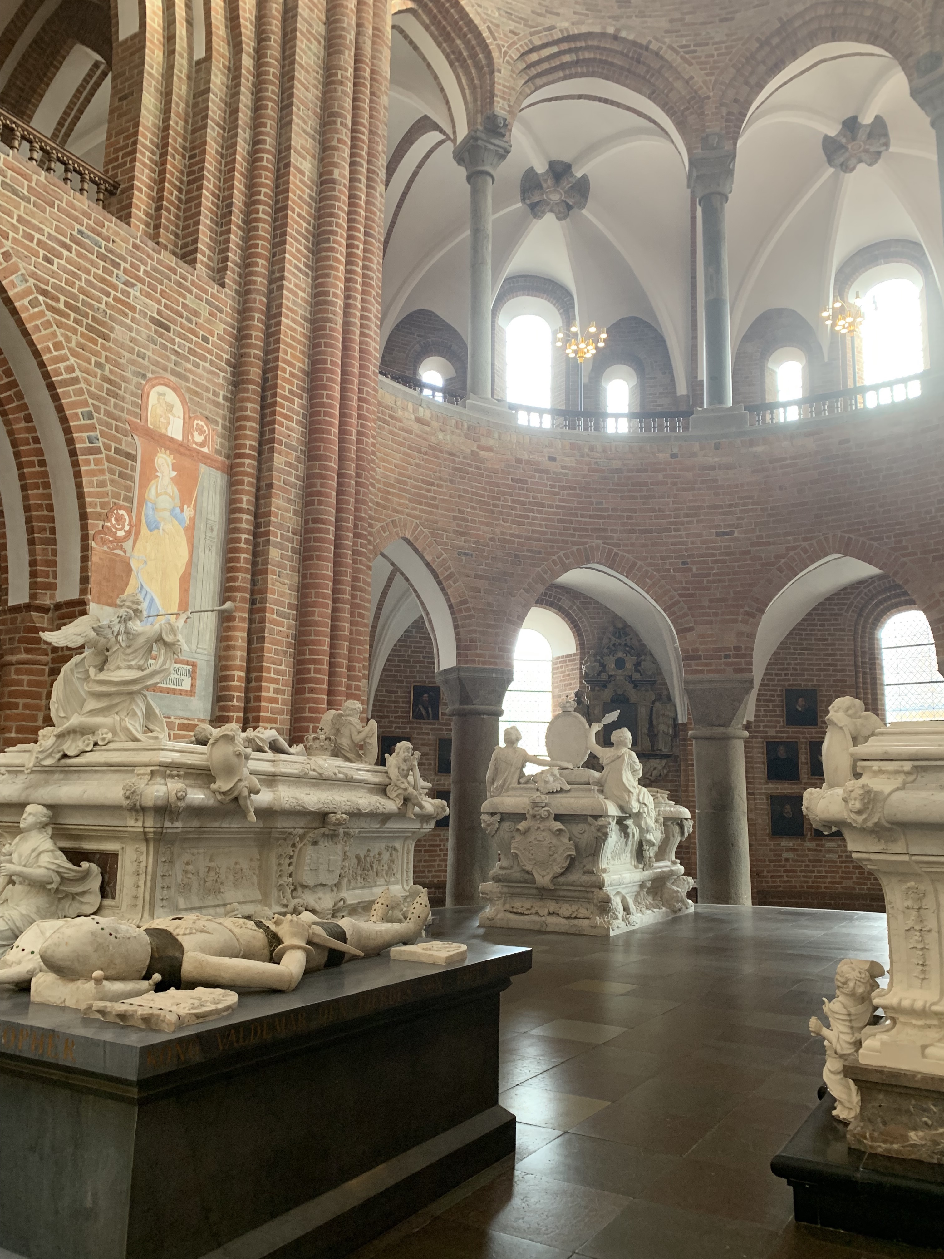 På vejen hjem mod hovedlandet svingede vi af til Roskilde for at se domkirken. Og det var et smuk oplevelse både at se kirken og  de mange sarkofager i kirken, hvor 40 kongelige ligger begravet. Lige fra Harald Blåtand, Frederik 9., Svend Estridsen, Margrete 1., Frederik 2, Dronning Ingrid og altså mange andre.