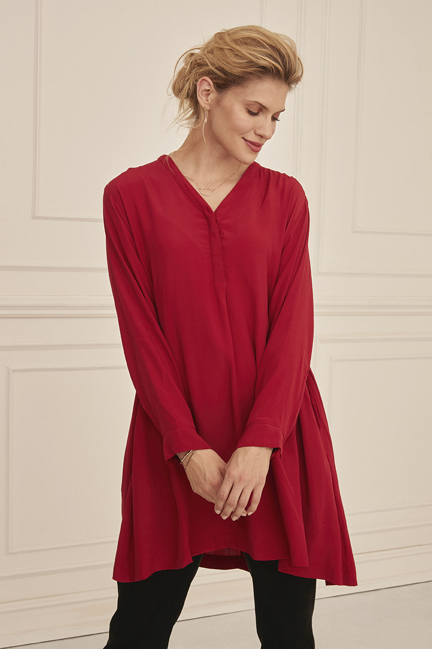 Tunikaen sidder flot til over brystet, mens den ekstra volumen i siderne understreger kjolens flotte A-form og giver det helt rigtige sving, når du bevæger dig. Den er desuden designet med en feminin V-hals med knapper.
