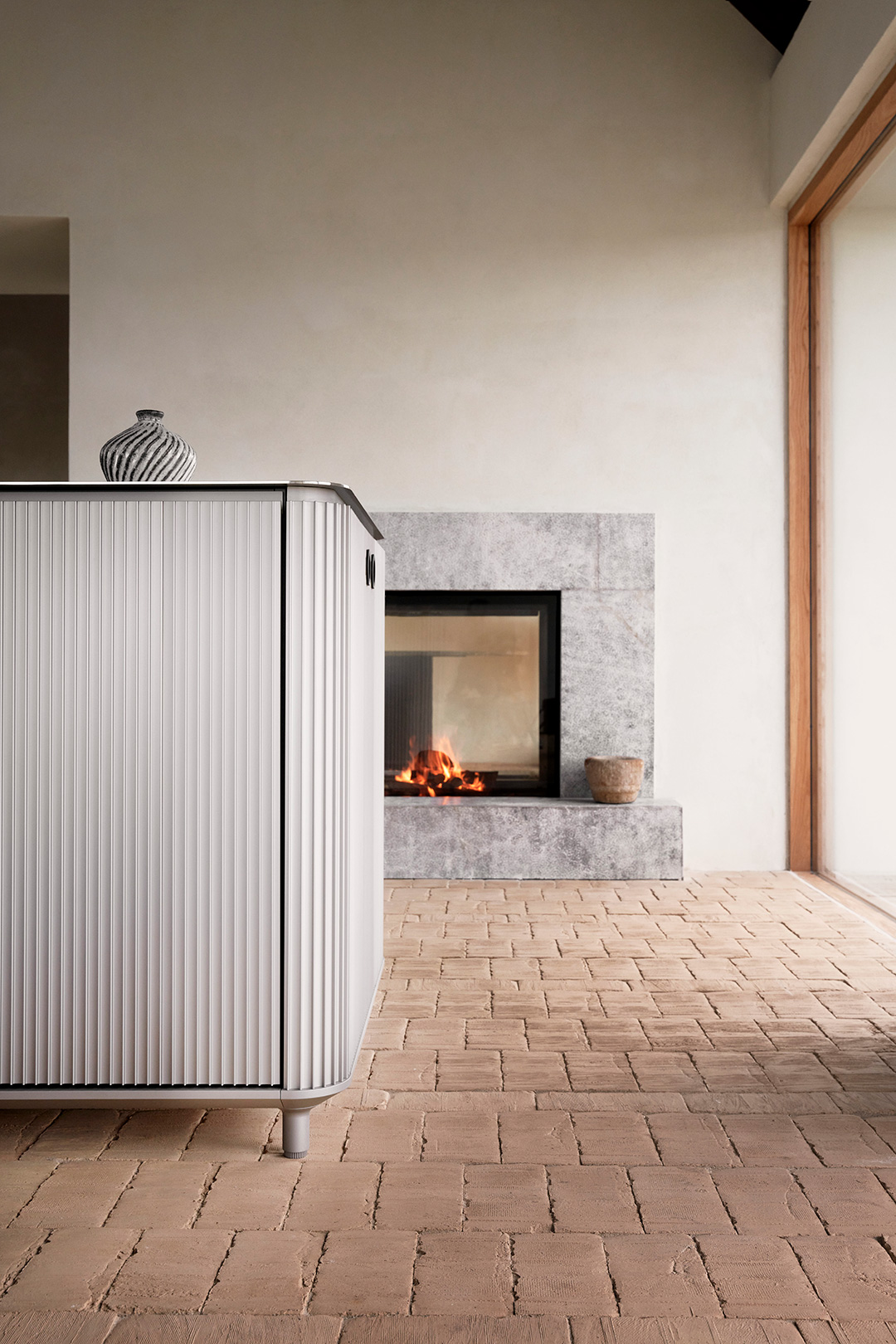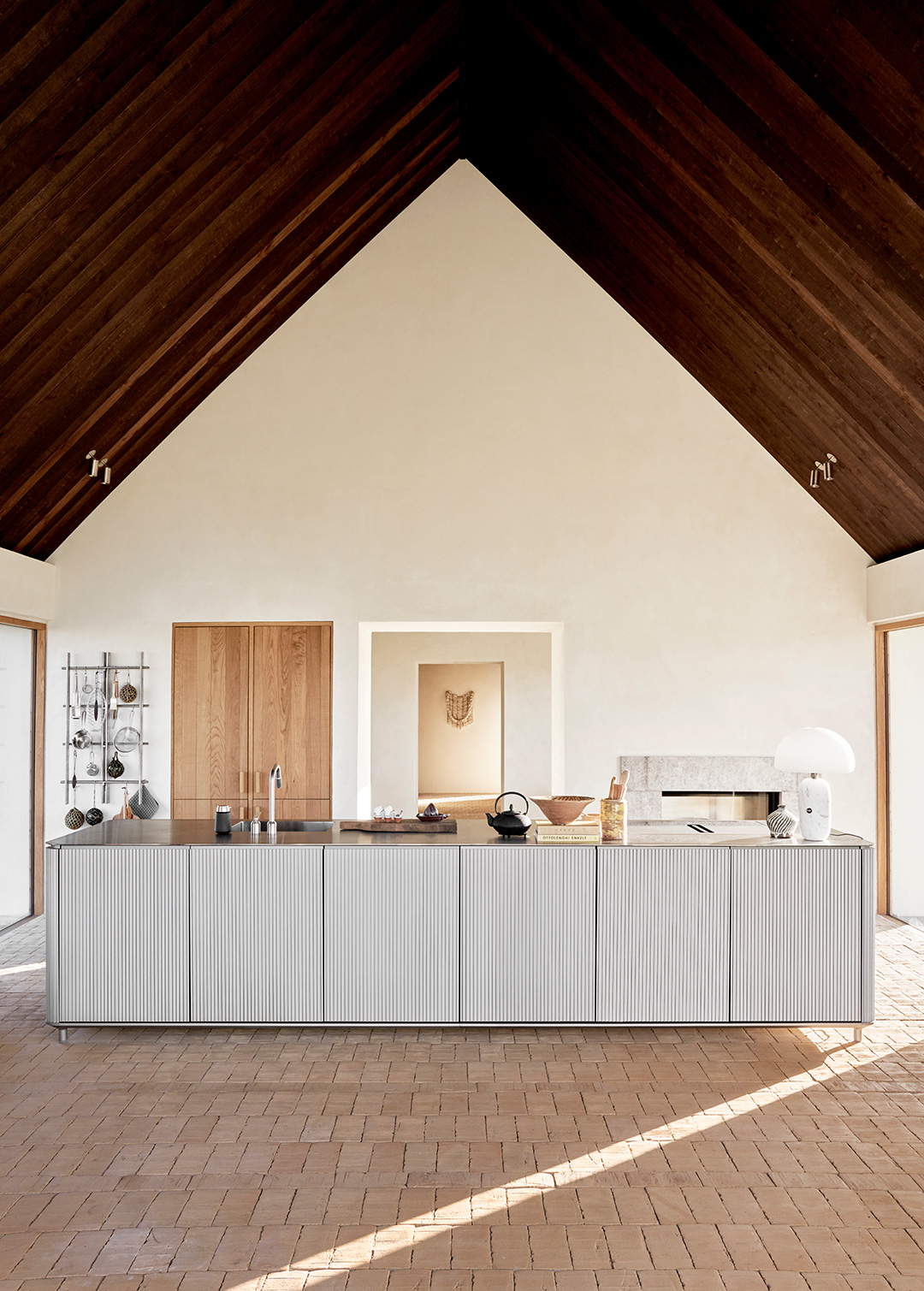 Køkkenskabene kommer med diskret integrerede greb, mens køle- og fryseskabe har lange greb med afrundede inderkanter af gummi, der kan klare vægten og trykket fra de tungere, lufttætte låger. Køkkenet er afsluttet med en 4-millimeters bordplade i rustfrit stål, der elegant svæver over skabene. Gasblus eller en induktionsløsning kan integreres i disken.