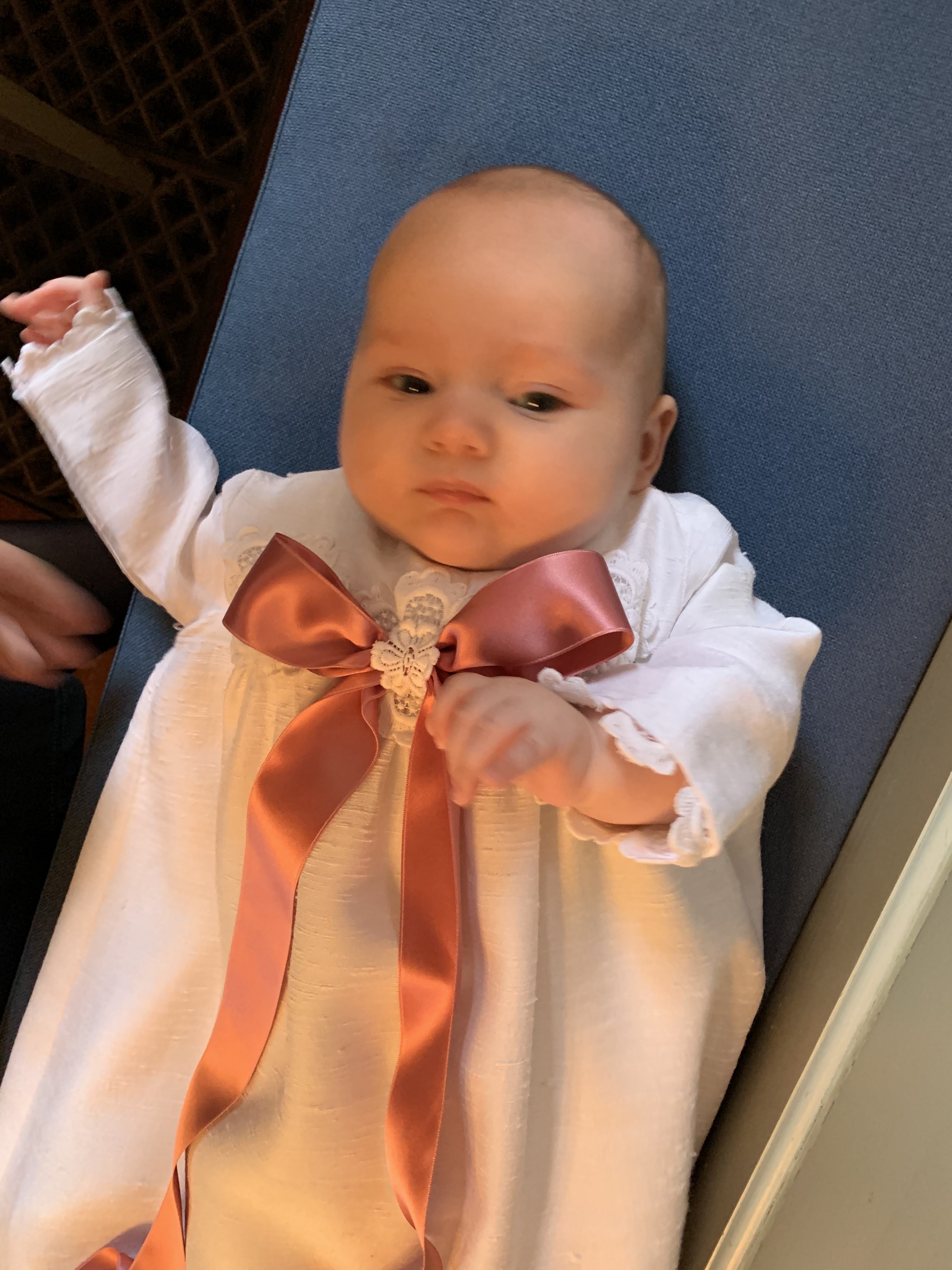 Mille var iført fars og onkels dåbskjole - syet af min brudekjole - blot var det lyseblå bånd skiftet ud med et rosa.