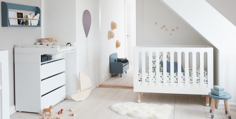 Udover at få styr på de vigtigste møbelelementer, har FLEXA skabt en rød tråd igennem designet og farverne, så det bliver en leg at indrette æstetisk, moderne og med roligt udtryk på babyværelset. Kombinationen af de hvide og lyseblå farver samt det lyse træ skaber en harmonisk atmosfære i indretningen og er et god bud på det perfekte babyværelse til drenge. Alle møblerne fås også i den smukkeste gammelrosa farve.