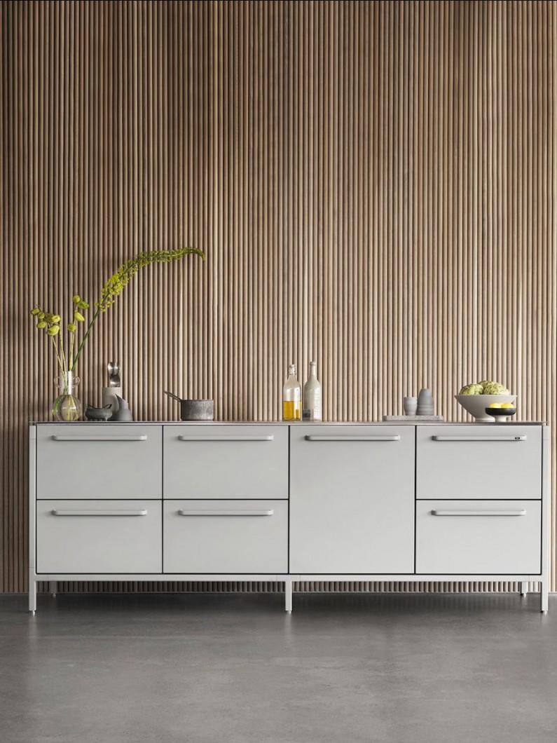 Køkkenet er designet af materialer som rustfrit stål og powder-coated aluminium og køkkenet fremtræder yderst elegant, matchende til alle øvrige Vipp-produkter.