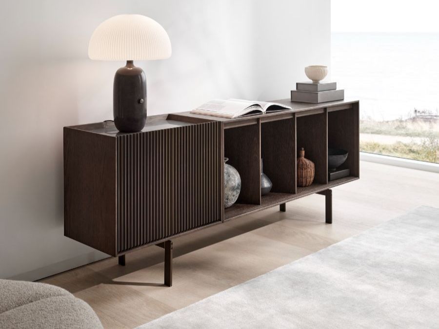 Vipp afviger fra sin lange historie med at arbejde med metal og gifter sig nu med mørk eg og marmor i det nye skab, Vipp675.