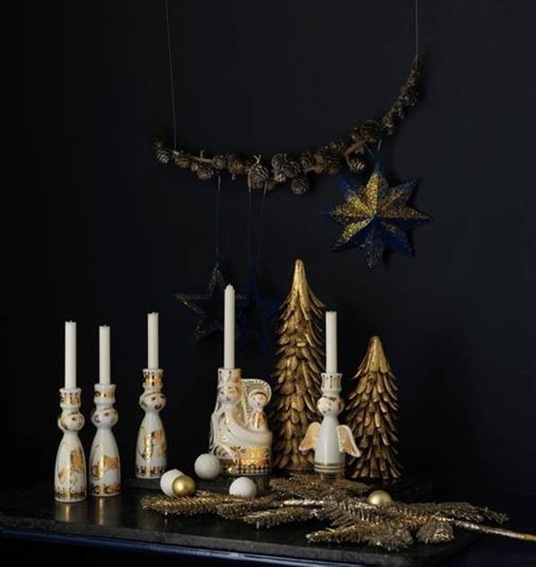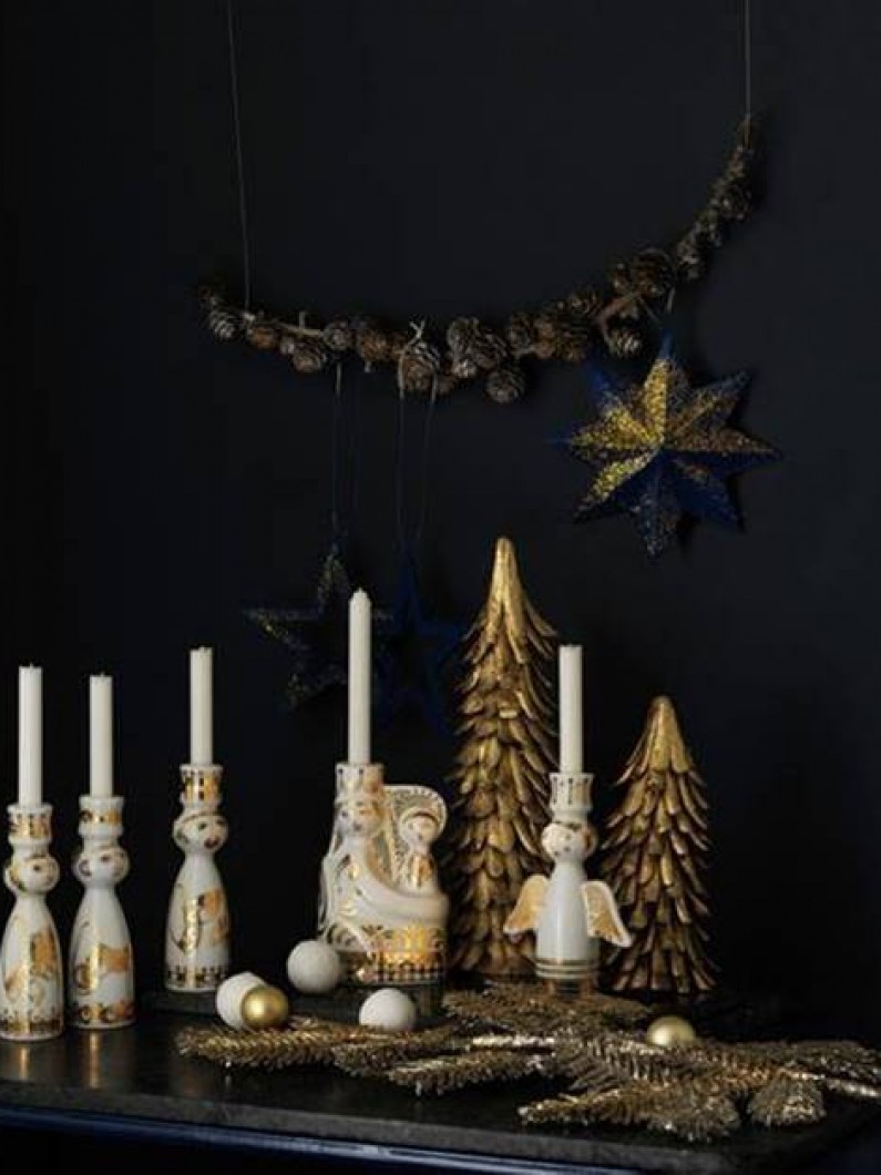 Her bærer englestager og kunstneriske krybbespil lyset frem med gavmilde gulddekorationer på hvidt porcelæn, mens interiørmodens megatrend – metallerne – fortolkes til grafiske guldkranse, der hænger fra loftet eller i vinduerne som et skatkammer af julestemning.