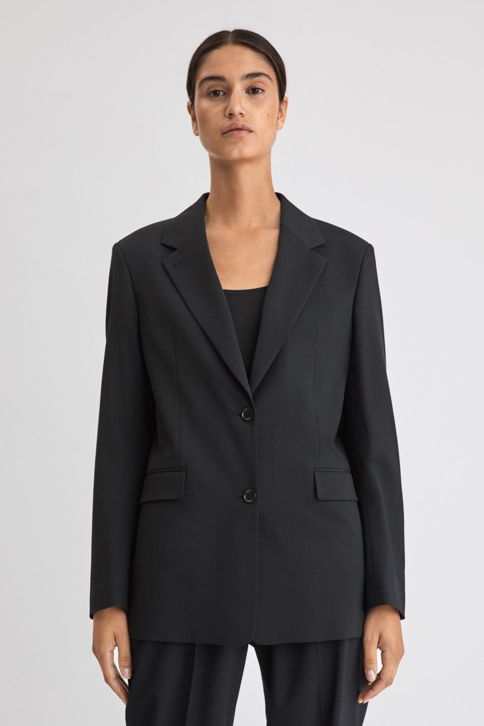 Både udgaver i sort og marine er fantastiske, men også forårets nye lyse farve er aldeles skøn. Bukserne er smukke med vidde og jakkerne er i et helt enkelt snit. Vælg at sætte en lille top, en silkeskjorte eller en tynd sweater under - eller vælg at bruge jakken uden andet end BH-en under.