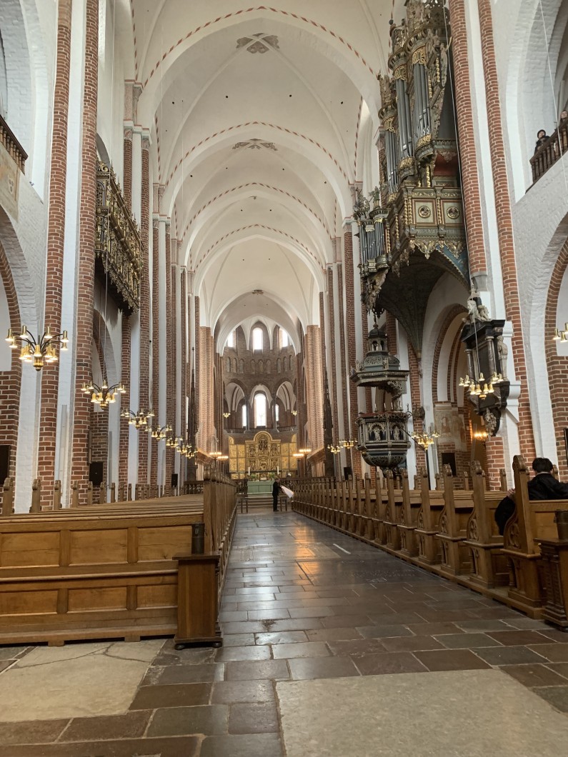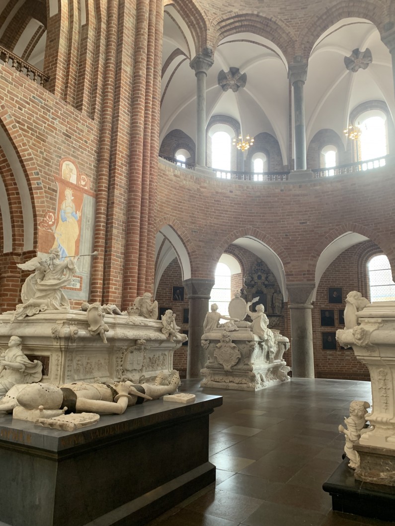 På vejen hjem mod hovedlandet svingede vi af til Roskilde for at se domkirken. Og det var et smuk oplevelse både at se kirken og  de mange sarkofager i kirken, hvor 40 kongelige ligger begravet. Lige fra Harald Blåtand, Frederik 9., Svend Estridsen, Margrete 1., Frederik 2, Dronning Ingrid og altså mange andre.