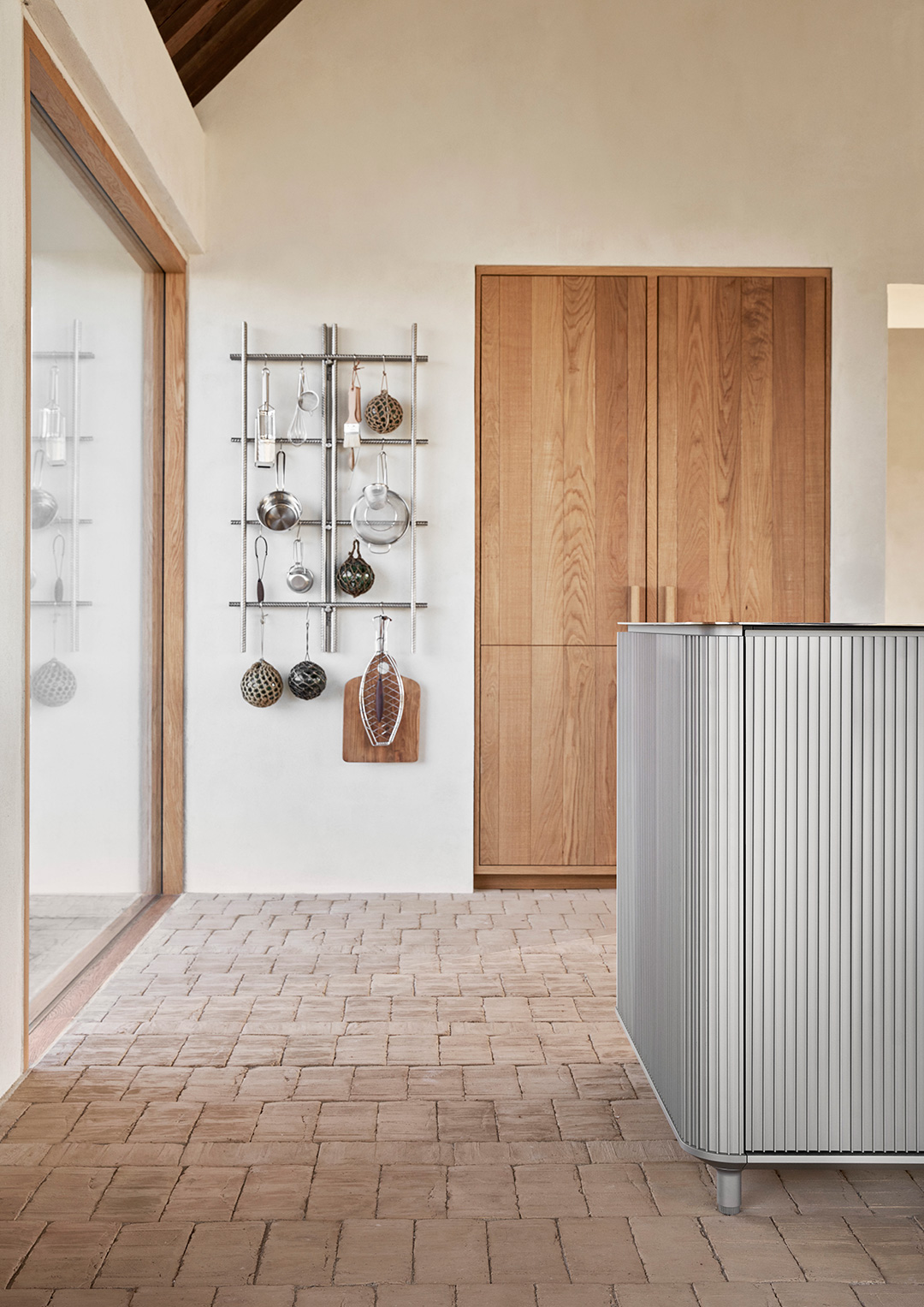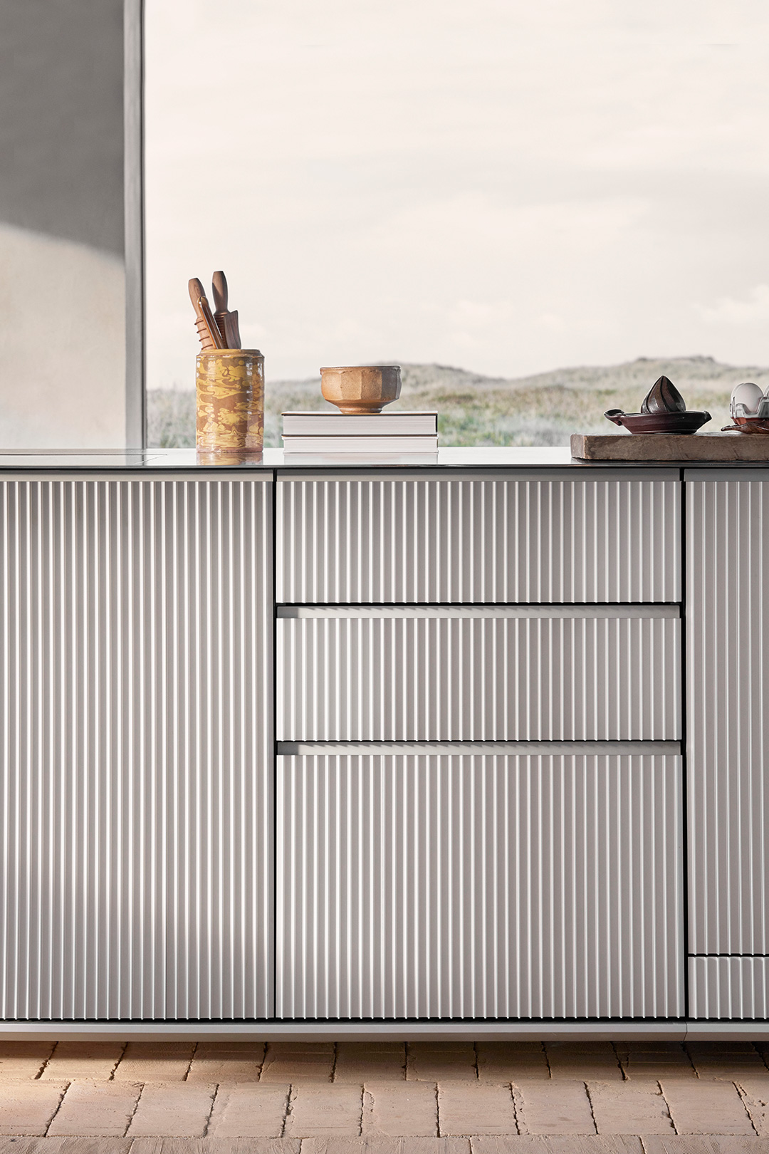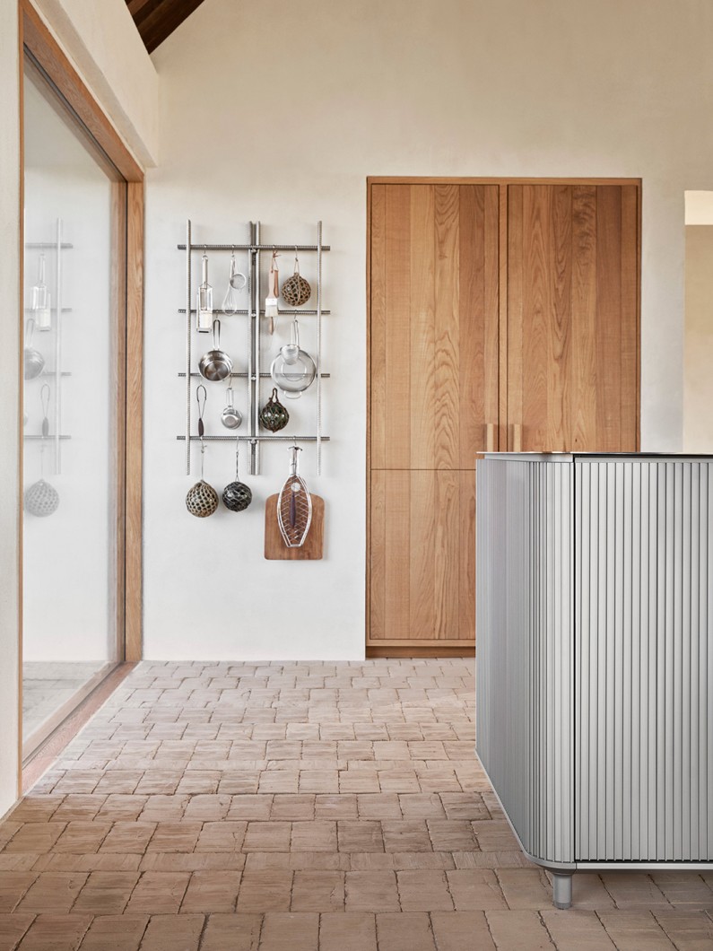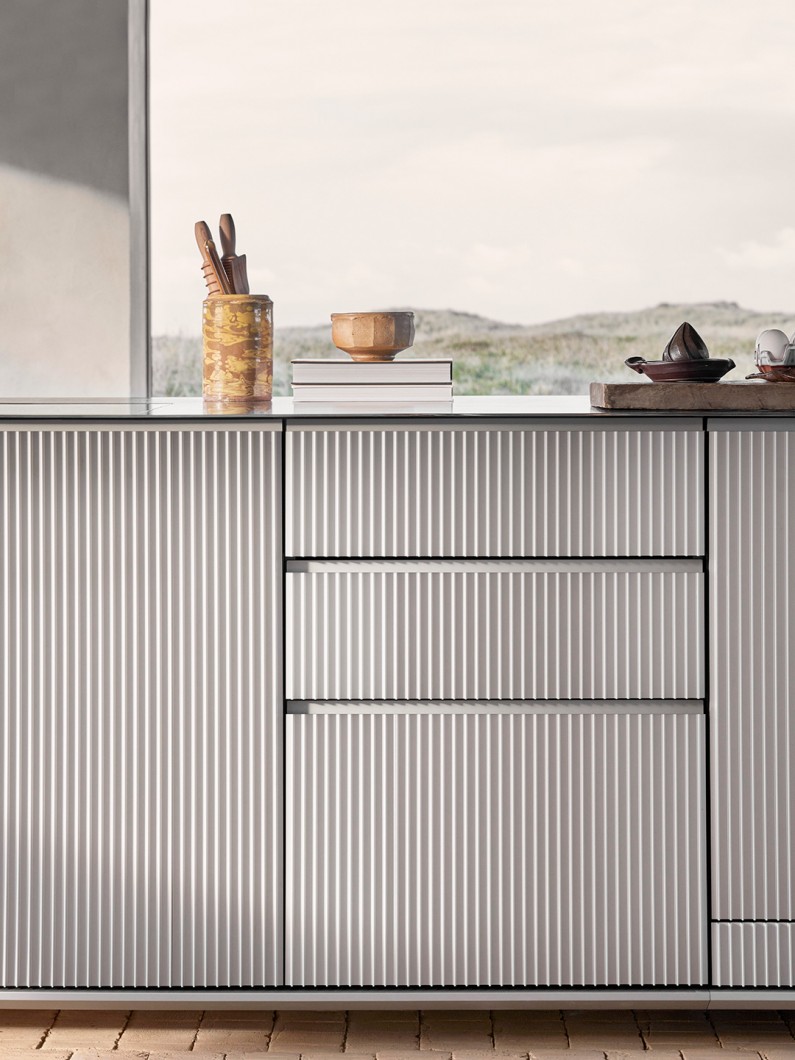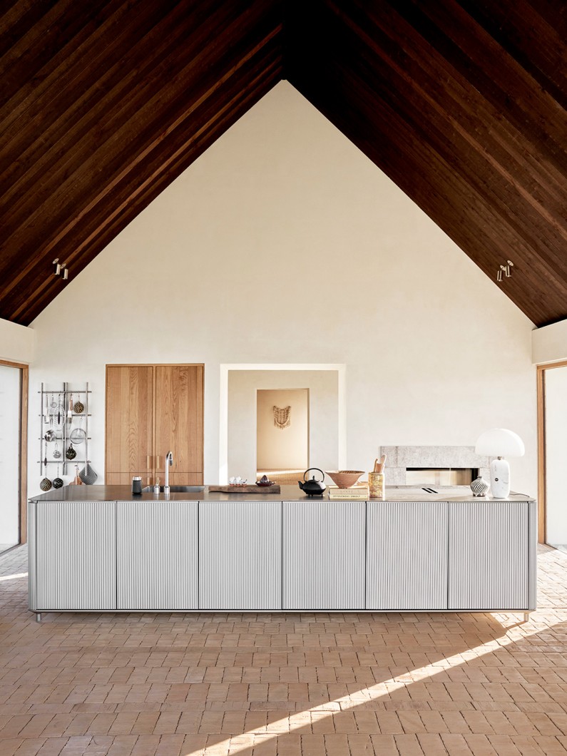 Køkkenskabene kommer med diskret integrerede greb, mens køle- og fryseskabe har lange greb med afrundede inderkanter af gummi, der kan klare vægten og trykket fra de tungere, lufttætte låger. Køkkenet er afsluttet med en 4-millimeters bordplade i rustfrit stål, der elegant svæver over skabene. Gasblus eller en induktionsløsning kan integreres i disken.