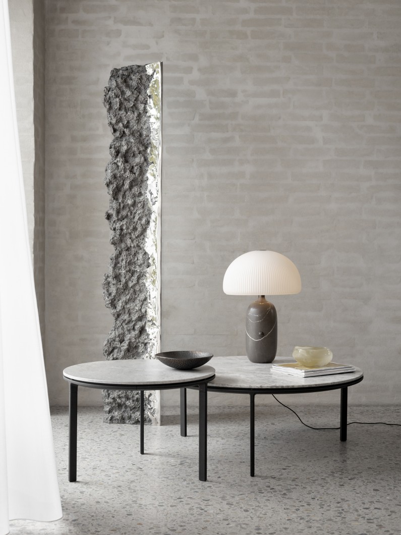 Vipp sofabord: Vipp423 og Vipp425 sofabordene i to størrelser fås nu i en ny himmelgrå farve. Hver bordplade er prydet med et anderledes og unikt marmor-åremønster og svæver over en trebenet ramme af sort pulverlakeret aluminium. Sofabordene kan stilles op alene eller parres for en komplet sammensætning.