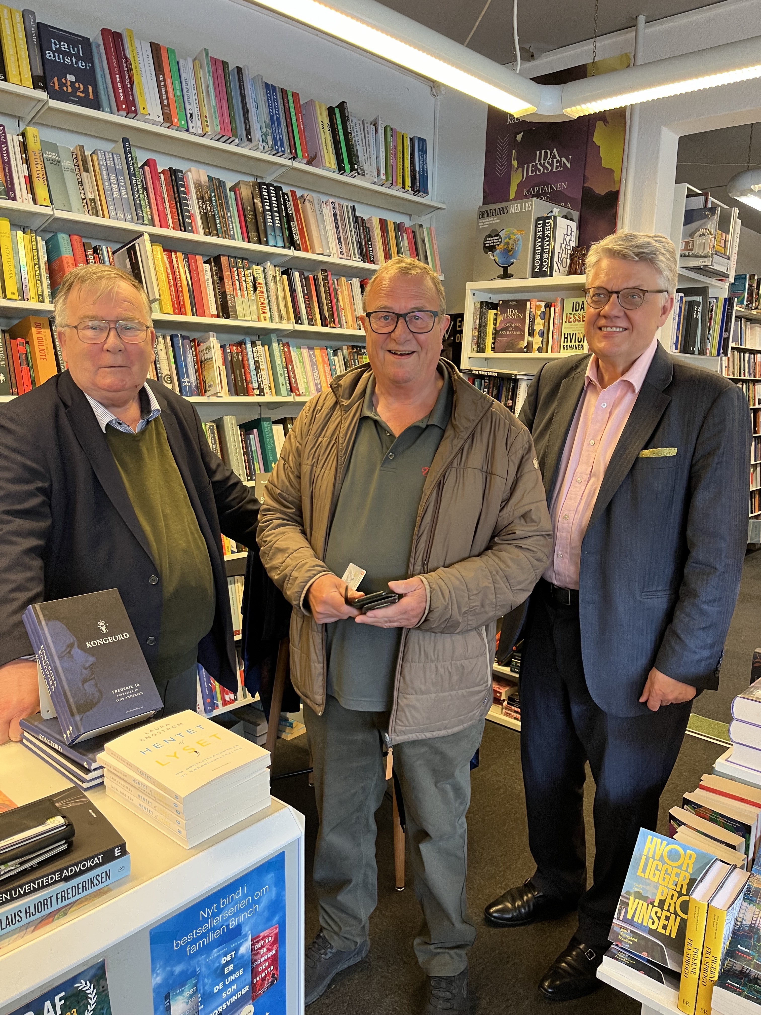 Claus Hjort Frederiksen signerede sin bog “Livvagten”, mens René Offersen (th.) signerede sin dugfriske bog, “Den uventede advokat”, som omhandler tiden i Esbjerg og også giver et indblik i advokatbranchen. Manden i midten er forhenværende bestyrelsesformand for TripleNine i Esbjerg, Erik Bonde Pedersen.