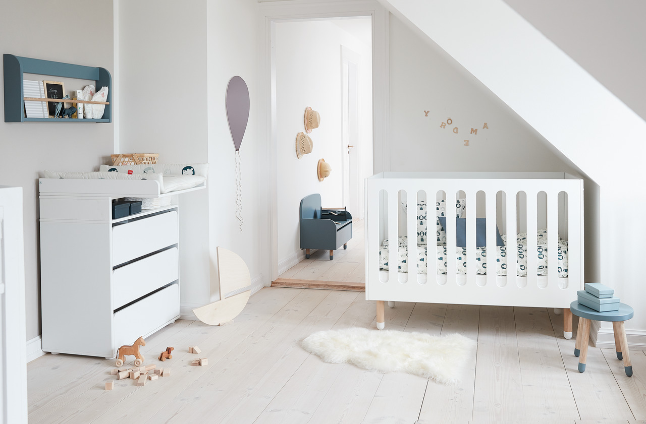 Udover at få styr på de vigtigste møbelelementer, har FLEXA skabt en rød tråd igennem designet og farverne, så det bliver en leg at indrette æstetisk, moderne og med roligt udtryk på babyværelset. Kombinationen af de hvide og lyseblå farver samt det lyse træ skaber en harmonisk atmosfære i indretningen og er et god bud på det perfekte babyværelse til drenge. Alle møblerne fås også i den smukkeste gammelrosa farve.