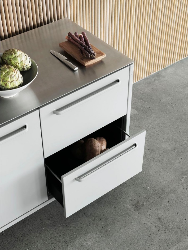 Køkkenet er designet af materialer som rustfrit stål og powder-coated aluminium og køkkenet fremtræder yderst elegant, matchende til alle øvrige Vipp-produkter.