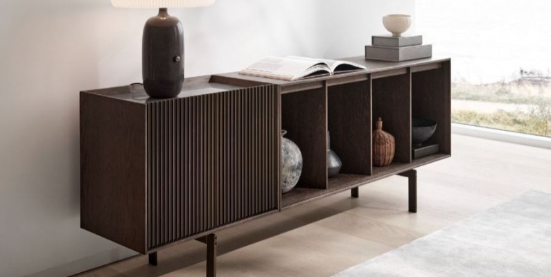 Vipp afviger fra sin lange historie med at arbejde med metal og gifter sig nu med mørk eg og marmor i det nye skab, Vipp675.